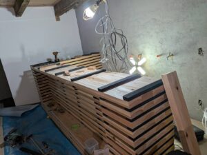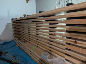 カウンターテーブルを作成中だったのだがこれがなんと!カット&塗装した木材をひとつひとつ組み上げっていってて…まさに唯一無二なものが完成しようとしていた。