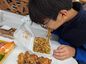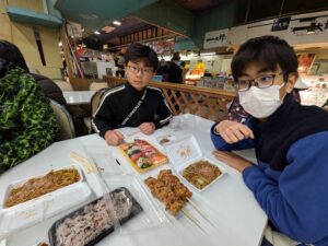 区分けされた商店が並んでいて、それぞれに寿司や揚げ物、焼きそば・たこ焼きその他もろもろが購入でき、すぐ横にはフードコートみたいにテーブル&椅子がたくさんあって、購入したものを食べることができる状態。