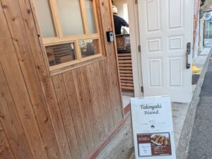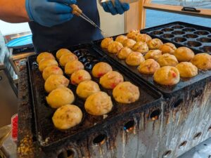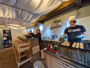中を覗くと「カギ印ソース」の社長さんがたこ焼きをつくっていた。