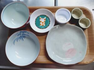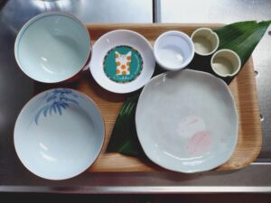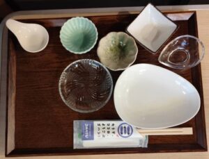 この度の団体様、直前の人数変更で食器類が足りず…ご来店までの日数がなく「簾箱」の補充ができないのでテーブルウェアを通常のものとは変更にして小皿・小鉢プレートにすることに。