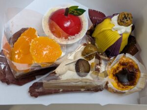 駅近くで夕食を済ませ、帰宅するためのバスを待つ時間になんとなくシーモール内の「シャトレーゼ」に立ち寄ったところ、ケーキのショーケースの端の方に「食品ロス削減のため」と、数種類のケーキがなんと!50%OFFで販売されていたΣ(・ω・ノ)ノ。