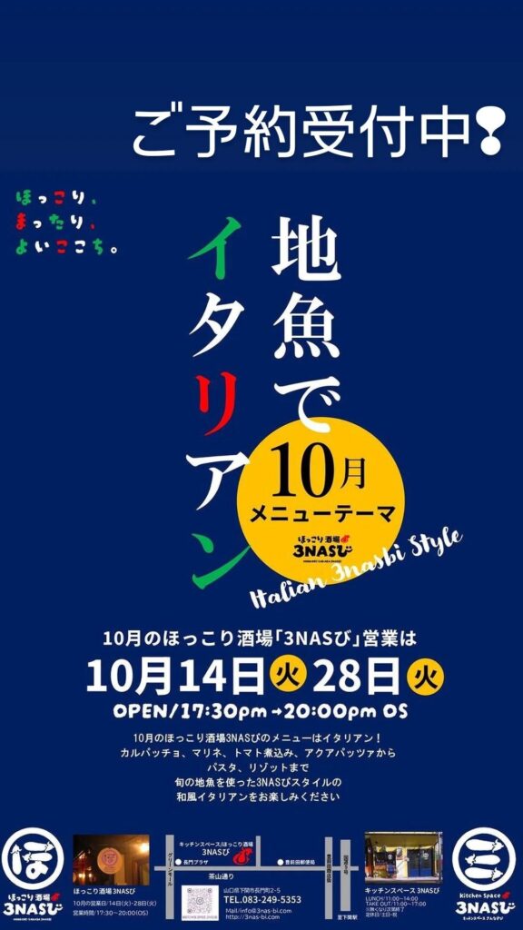 3NASびが自信をもってお届けする「地魚でイタリアン」コースの『ほっこり酒場』、10月次回開催は28日(火)。ご予約受付中。