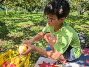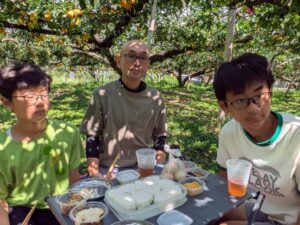 実際に周りを見渡すと、お弁当を持ってきて食べてる我が家の方が、周りの人よりもたくさんの梨を食べているという状態。