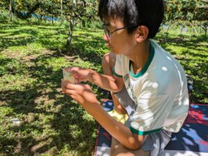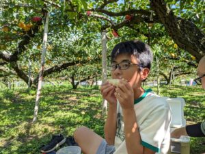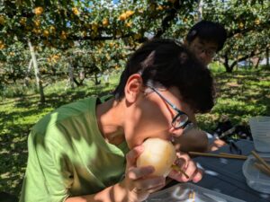 これこそ梨狩り満喫の極み!と思っているのだけれど、周りを見ると、どのグループも採れたてのぬるい梨のみをもぐもぐ…。